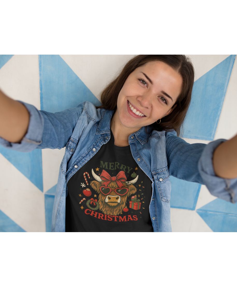 Koszulka „Merry Christmas” z uroczą krówką w serduszkowych okularach i świątecznej kokardzie to idealny wybór dla kobiet, które lubią połączyć poczucie humoru z klimatem Bożego Narodzenia.