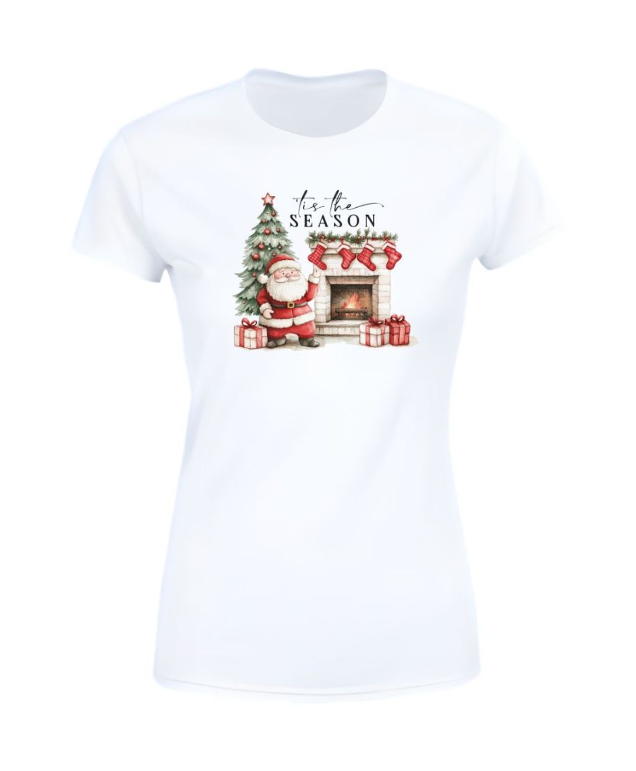 Koszulka damska Świąteczna Mikołaj przy kominku świąteczny nastrój choinka