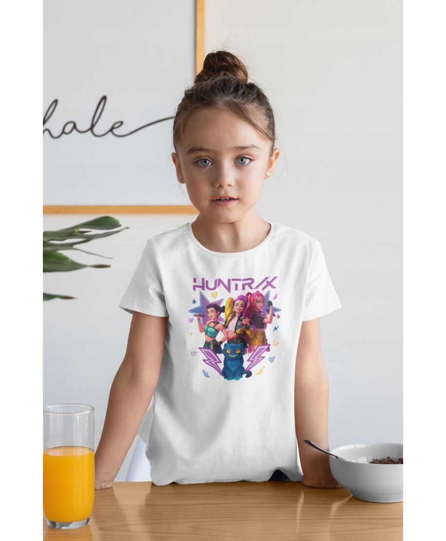Na koszulce znajduje się kolorowa grafika inspirowana popularną animacją HUNTRIX, przedstawiająca trzy główne bohaterki – odważne, pewne siebie i gotowe stawić czoła każdemu wyzwaniu!