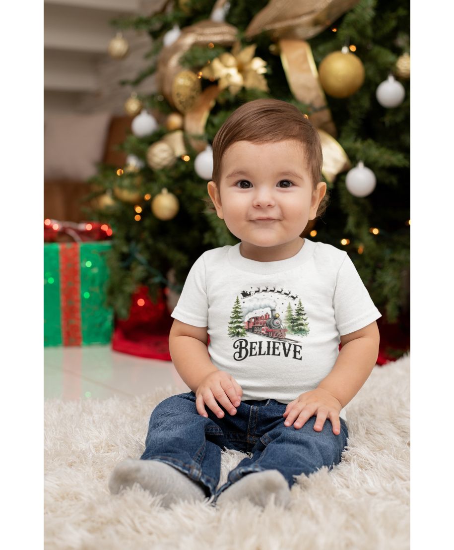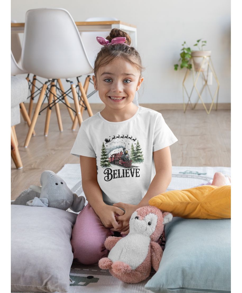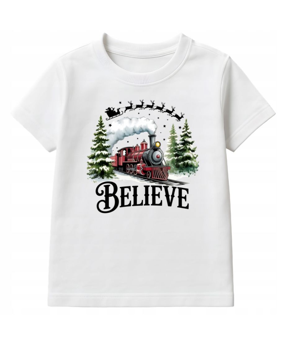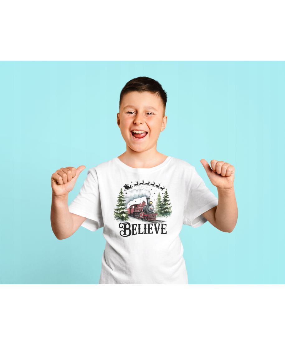 Koszulka dziecięca Świąteczna „Believe” magiczny pociąg Mikołaja
