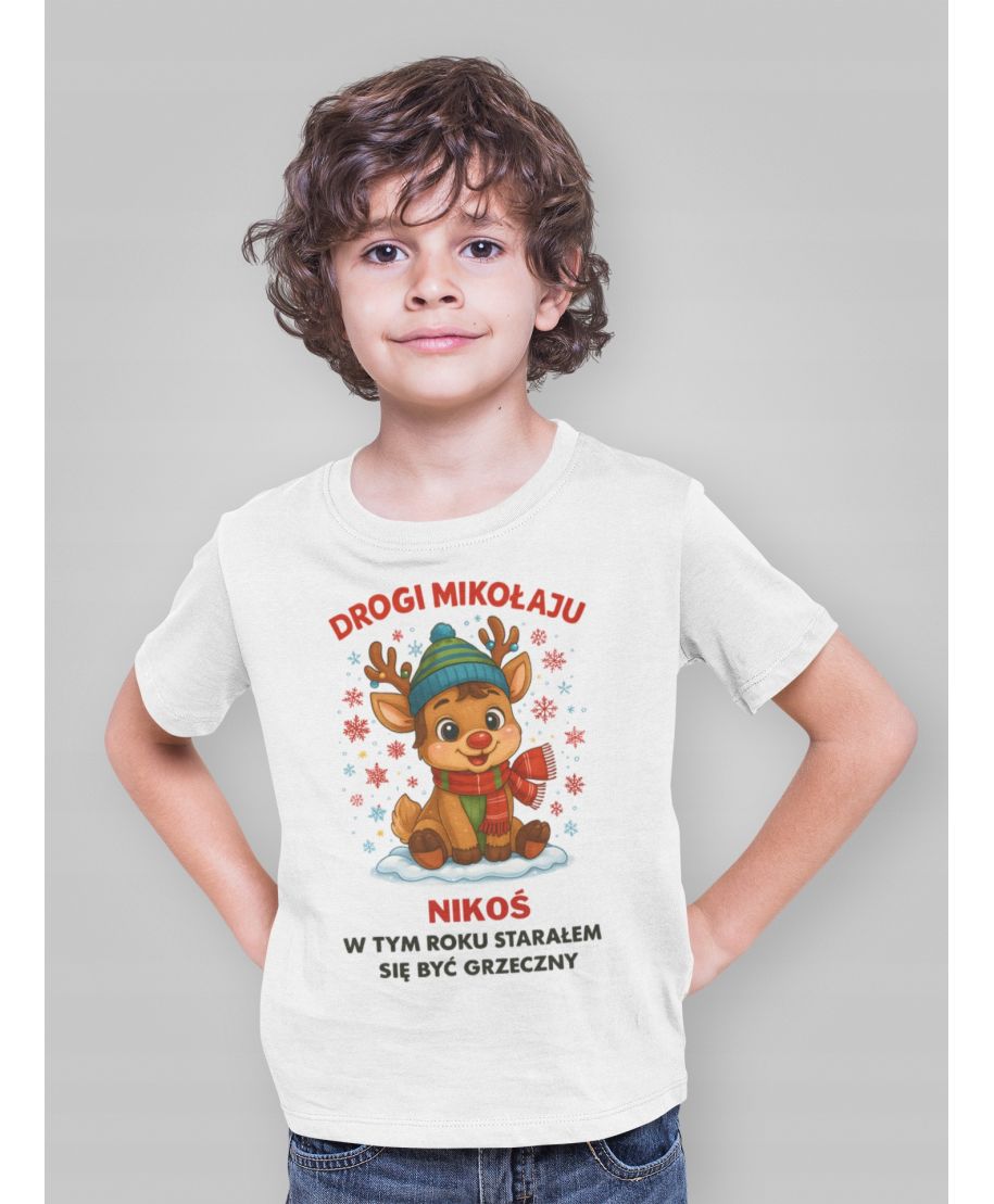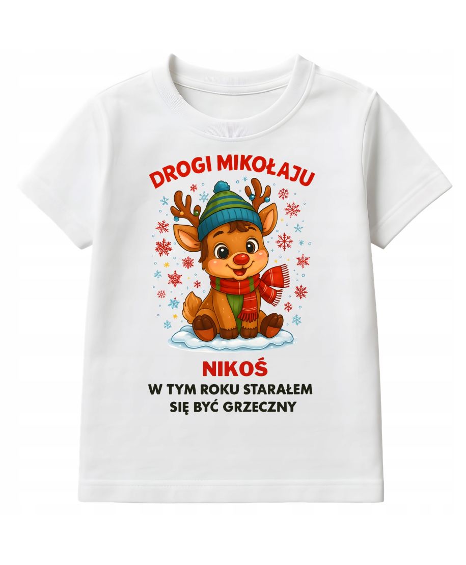 Na koszulce znajduje się uroczy, bajkowy reniferek–chłopiec w zimowej czapce i szaliku, siedzący na śniegu. Wokół niego wirują kolorowe płatki śniegu, a nad grafiką widnieje napis „DROGI MIKOŁAJU” – "W TYM ROKU STARAŁEM SIE BYĆ GRZECZNY" całość wygląda jak ilustracja z dziecięcej, świątecznej książki.