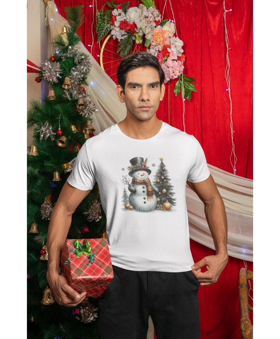 Nadruk przedstawia urokliwego bałwanka w eleganckim cylindrze, który uśmiecha się przy świątecznej choince. Bałwanek ubrany jest w kolorowy szalik, a wokół niego padają delikatne śnieżki, tworząc magiczny zimowy klimat. Choinka jest ozdobiona złotymi bombkami i gwiazdą na szczycie, co dodaje całości elegancji i świątecznego blasku.